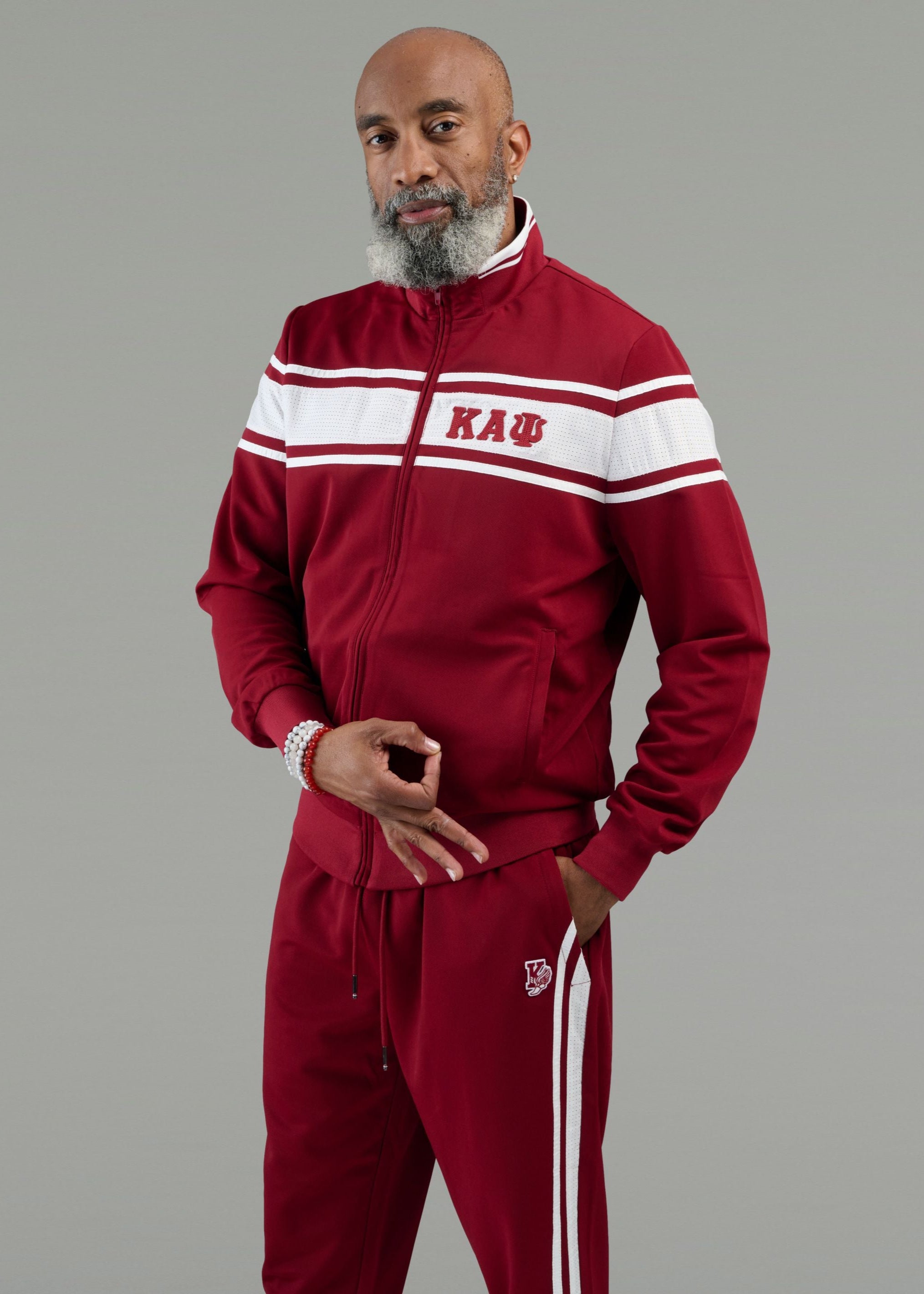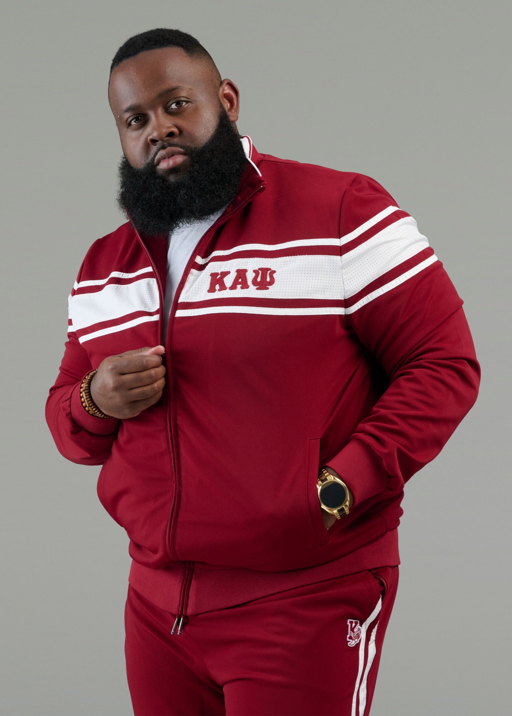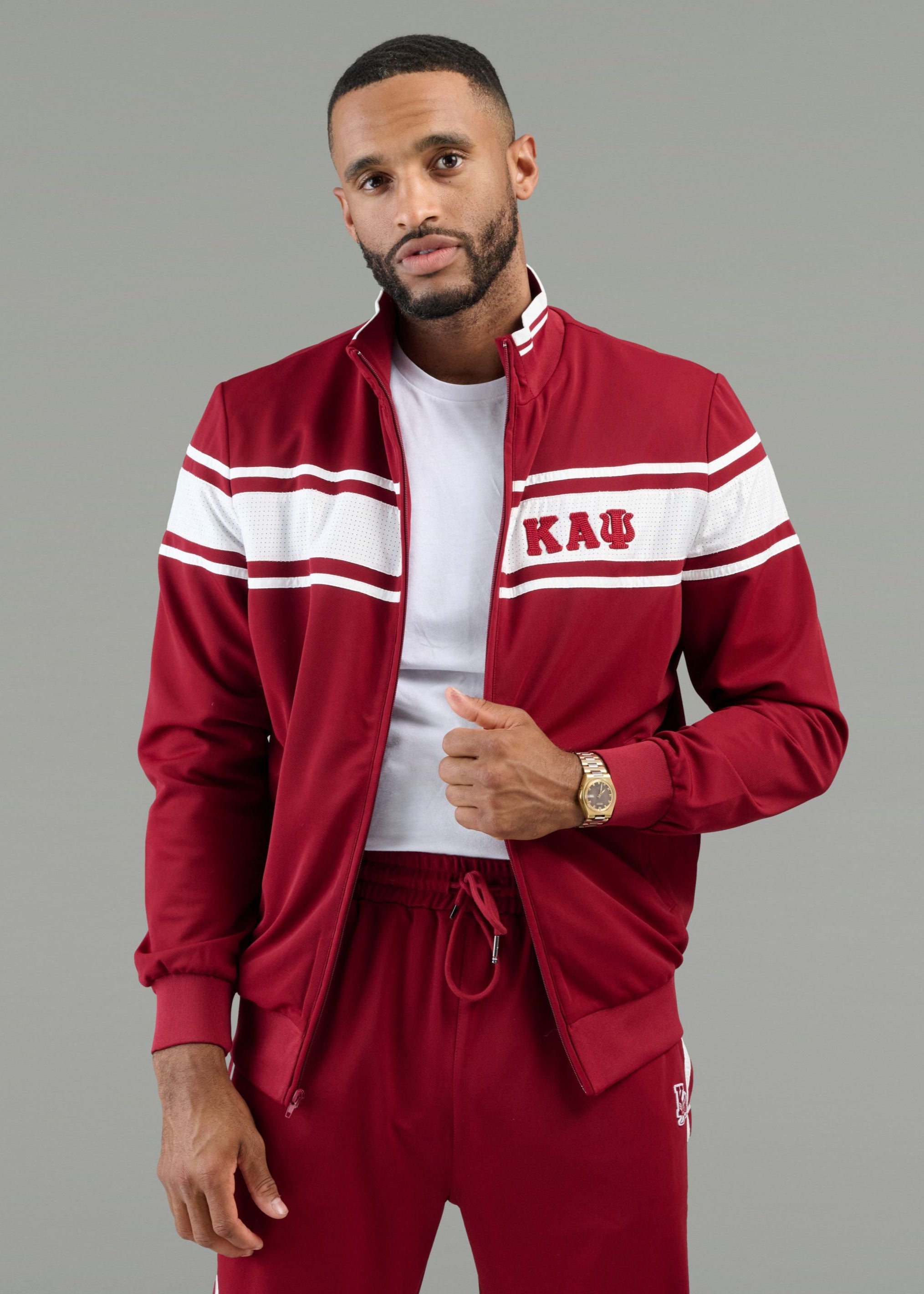 Made for Nupes designed for life...this is the set you'll want to wear all season long. Whether you're headed to homecoming, or lounging at home, this tracksuit is your ticket to comfort and style. This jacket is made from wrinkle-resistant twill and features a mesh panel in our signature 3-stripe design. It is complete with a full zip design textured 3D puff embroidered Kappa Alpha Psi Greek letters.