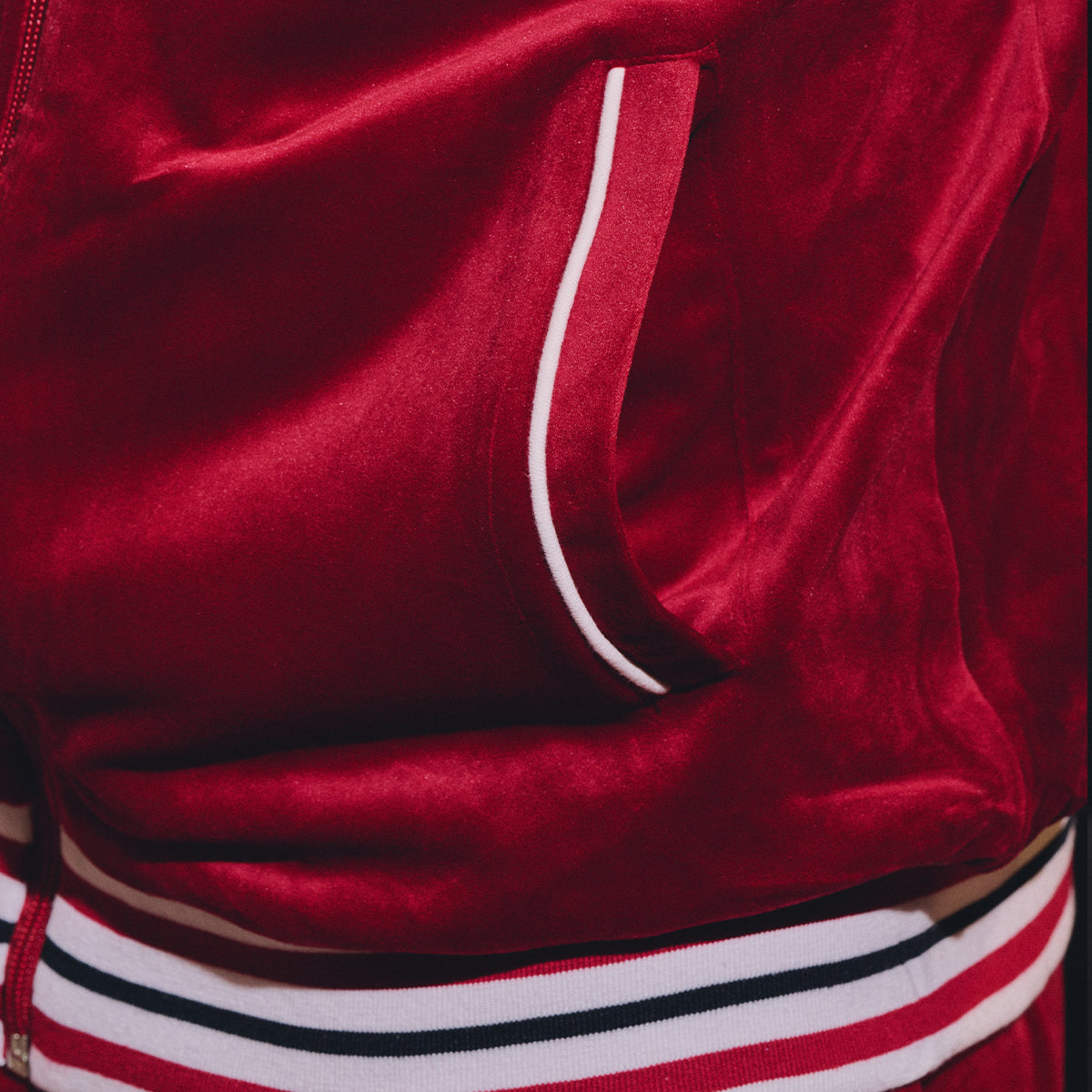 Achieve in every field and on every court in this all-day athleisure set.  Featuring plush krimson velour, quality embroidered details, and retro stripes at the waistband and cuffs, you will make a smooth transition into fall whether you’re in the game or in the stands.