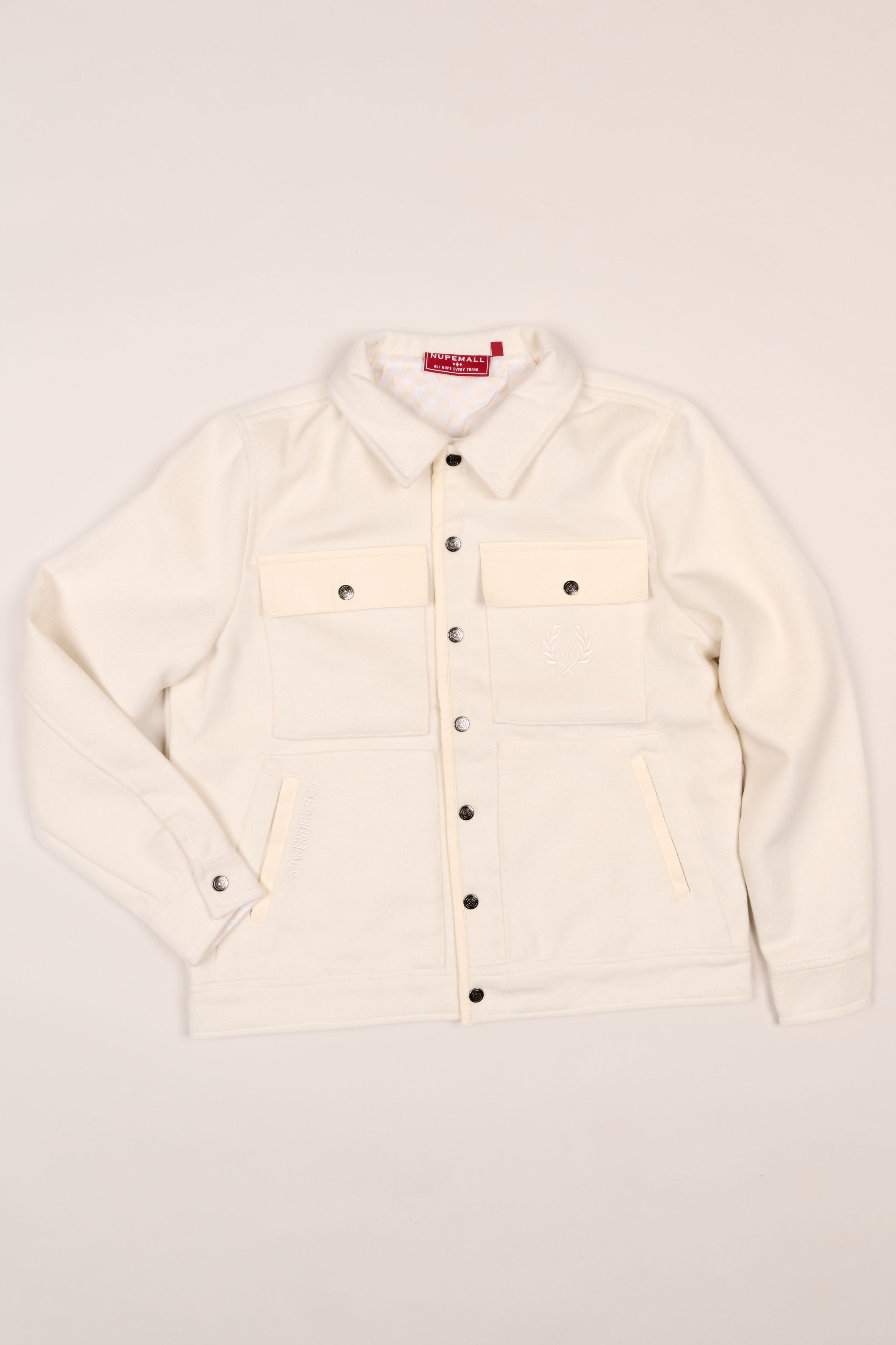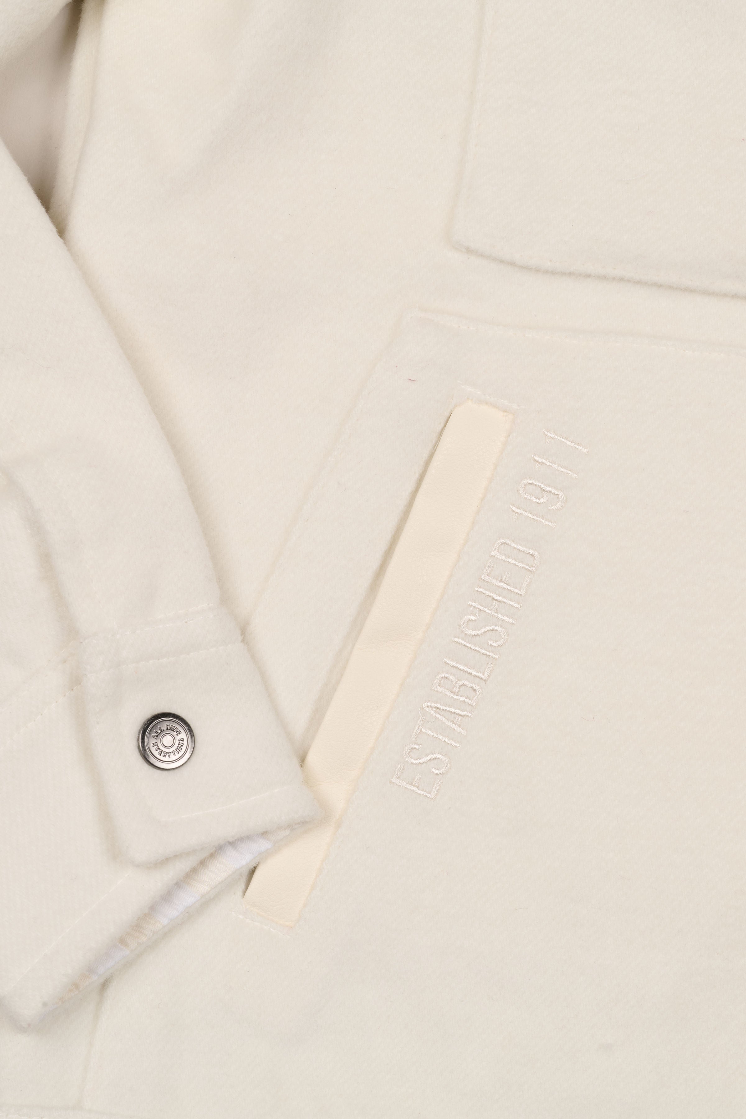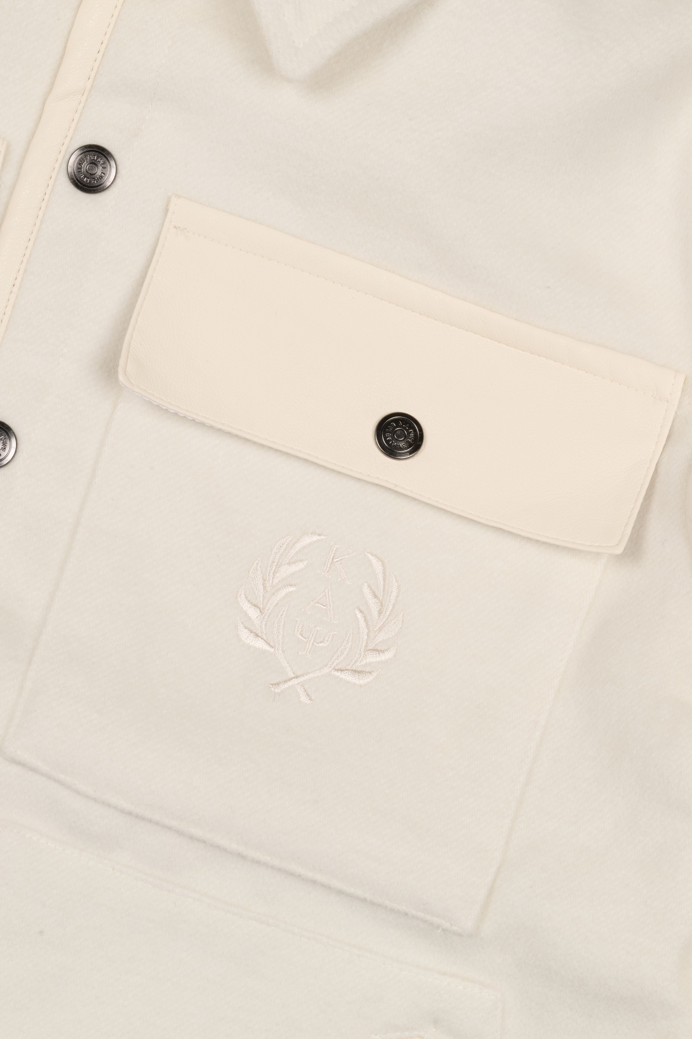 The Kappa Alpha Psi 3-Letter Wreath Trucker Jacket is a bold statement piece that carries the weight of tradition with a modern edge. Crafted in a clean cream tone on tone, this classic trucker silhouette is elevated with vegan leather accents, and the 3-letter Wreath embroidered with detail and pride.