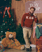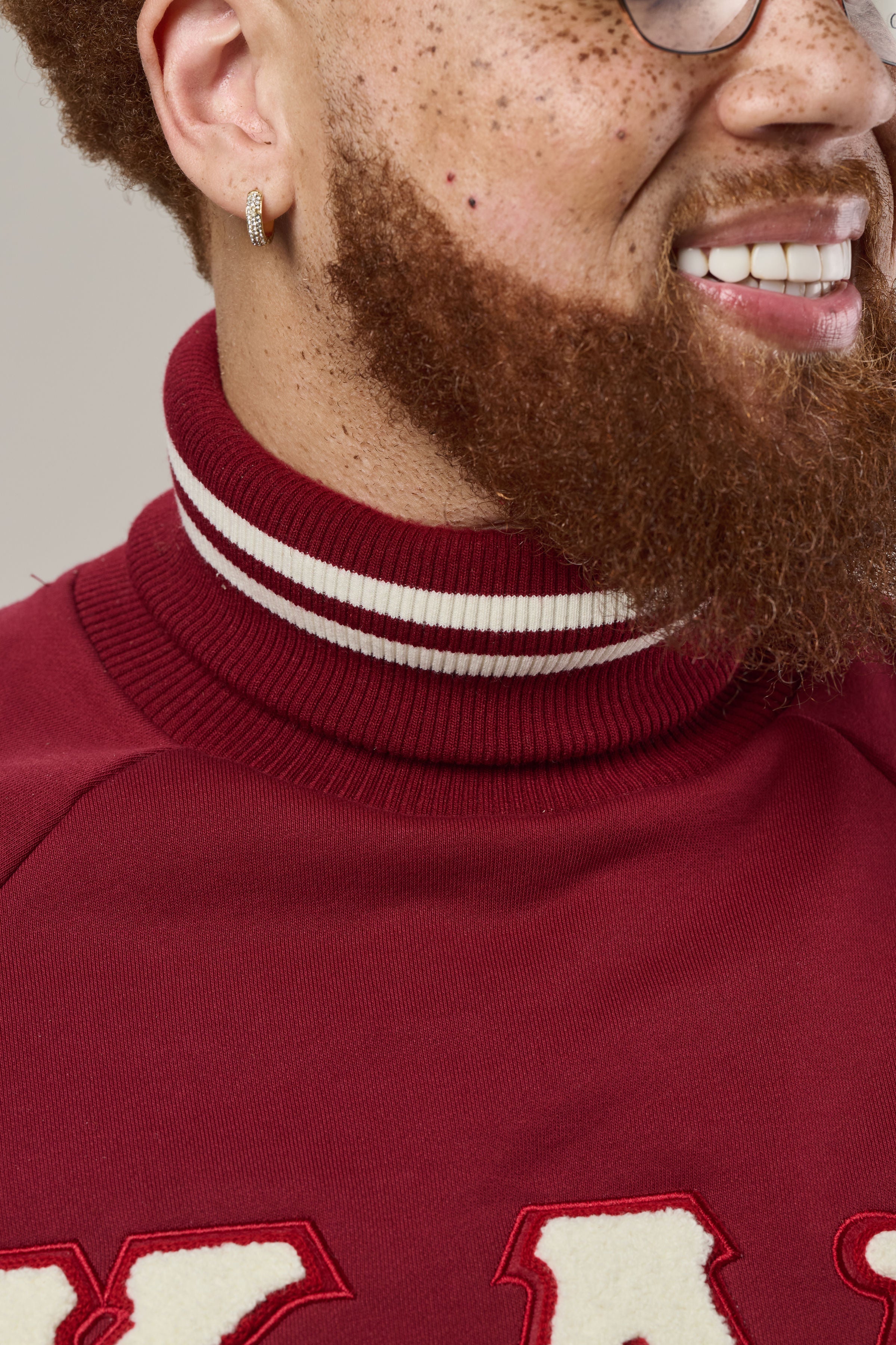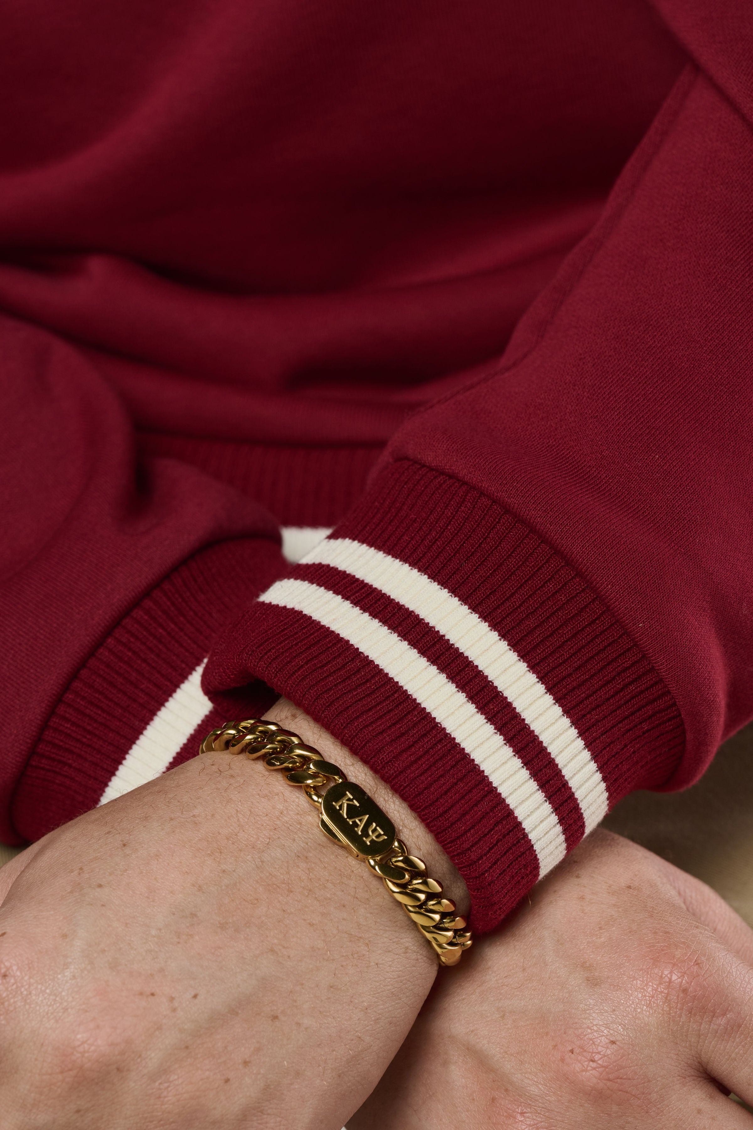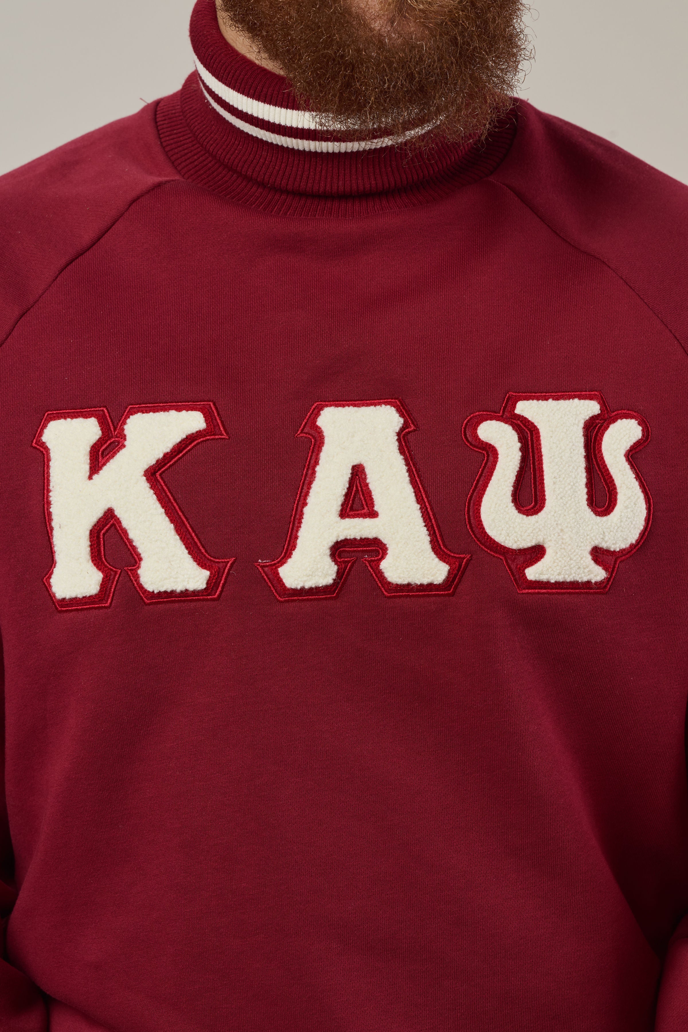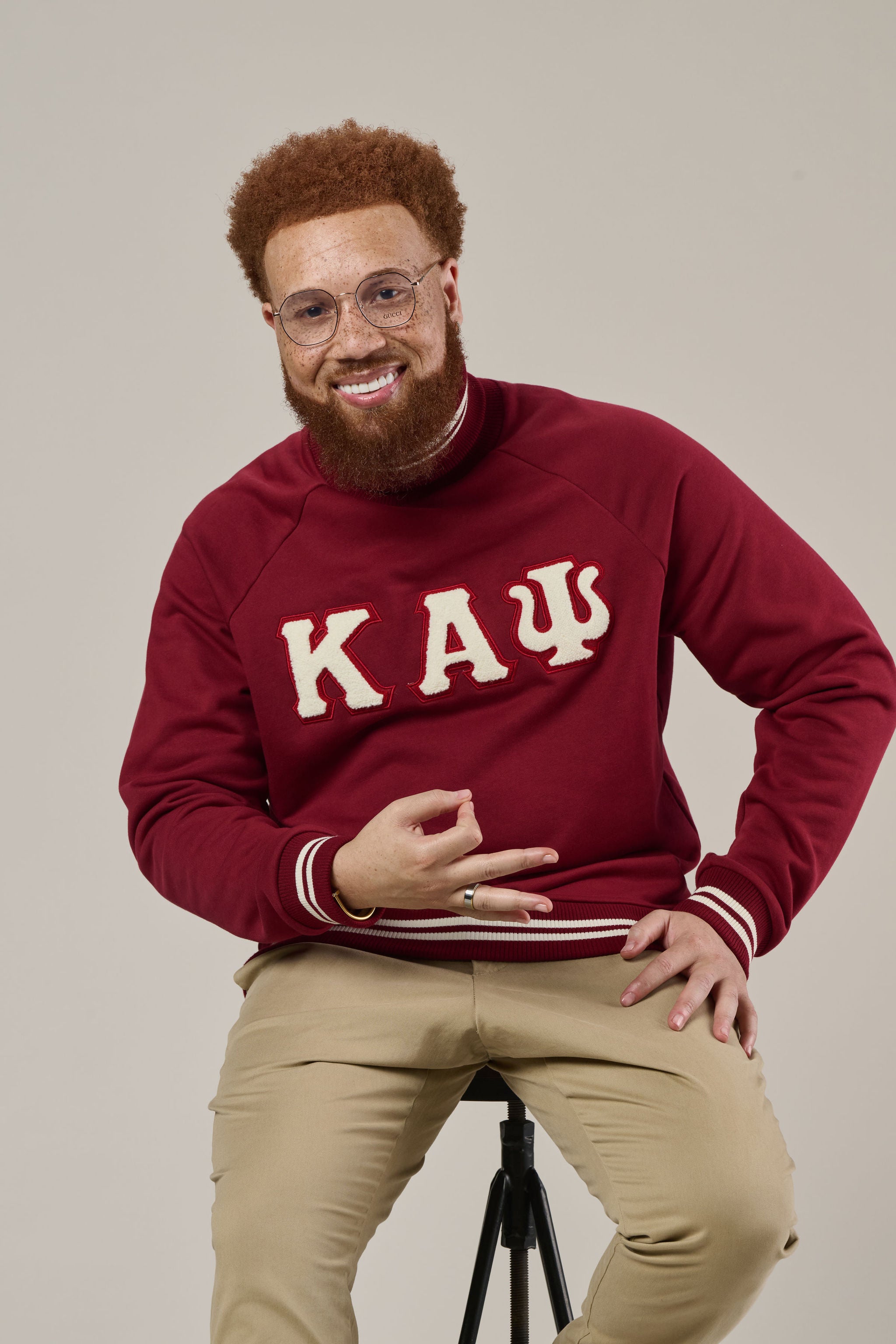 Bold chenille 3-Letter ΚΑΨ lettering adds rich texture and depth across the chest, giving it a standout varsity look. Signature crimson-and-cream stripe detailing on the rib collar, sleeve cuffs, and bottom hem ties everything together with authentic Kappa character.