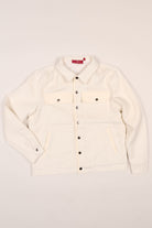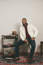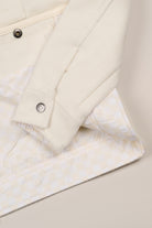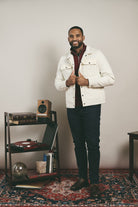The Kappa Alpha Psi 3-Letter Wreath Trucker Jacket is a bold statement piece that carries the weight of tradition with a modern edge. Crafted in a clean cream tone on tone, this classic trucker silhouette is elevated with vegan leather accents, and the 3-letter Wreath embroidered with detail and pride.