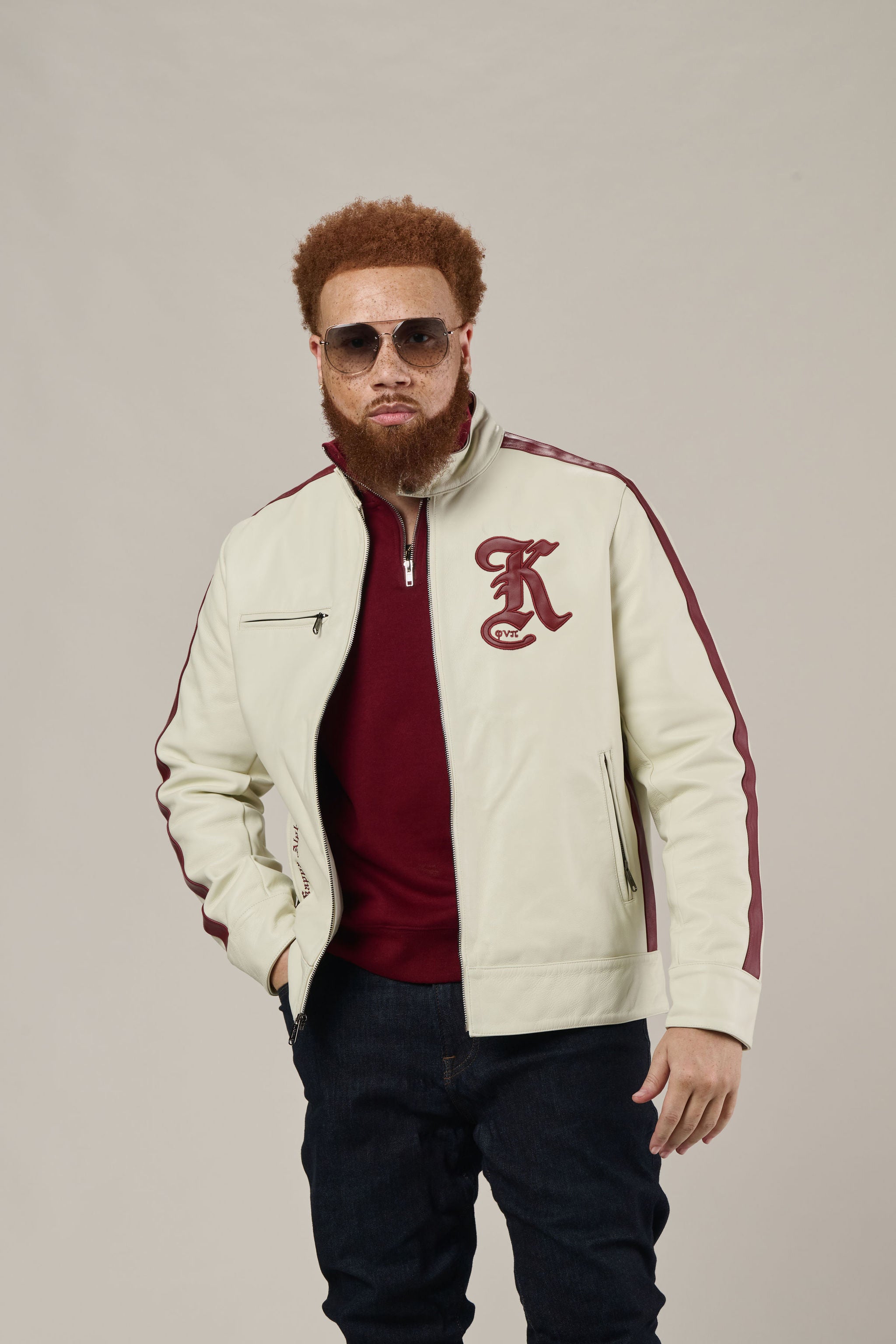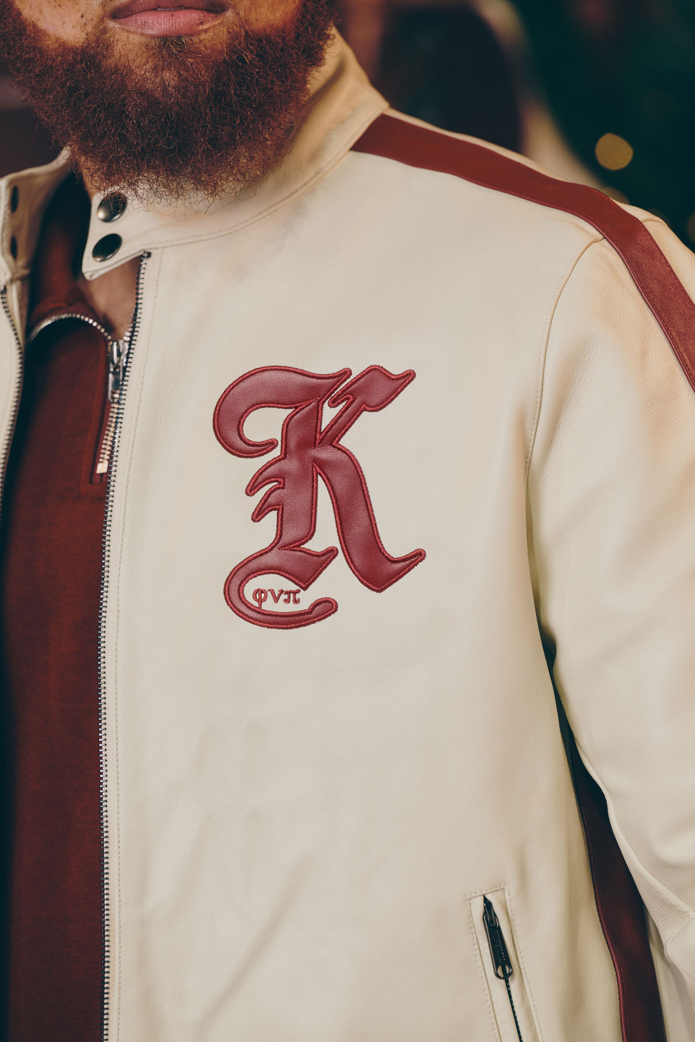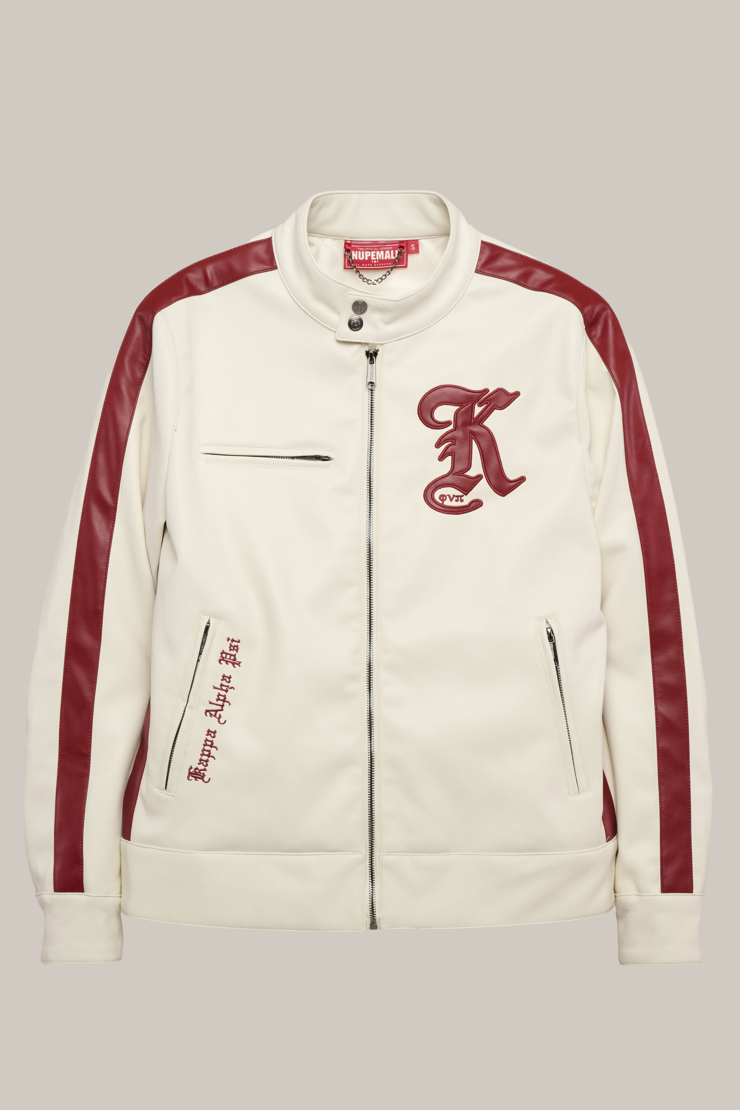 An Old English “K” applique anchors the left chest, while dynamic racing stripes along the sleeves and sides bring movement and energy to the design. Functional front zipper pockets are embroidered with Kappa Alpha Psi along the right side for a clean, elevated detail. The moto mock neck with custom snap buttons completes the silhouette with an authentic racing feel.