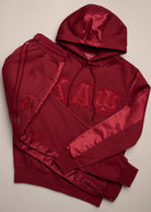 You know we love a matching moment. Show off your holiday drip in this must-have satin hoodie and jogger set.