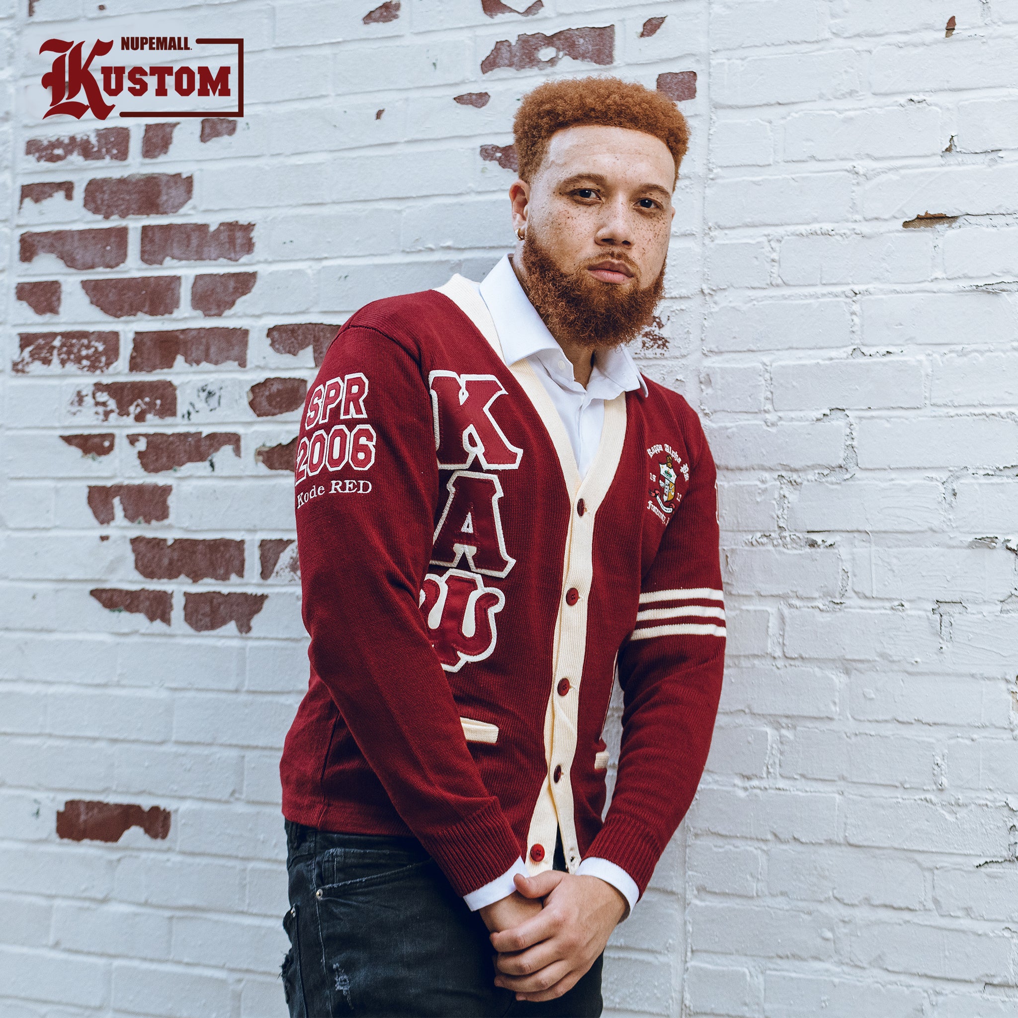 Krimson and Kreme Kappa Alpha Psi cardigan featuring the Greek letters and Coat of Arms.